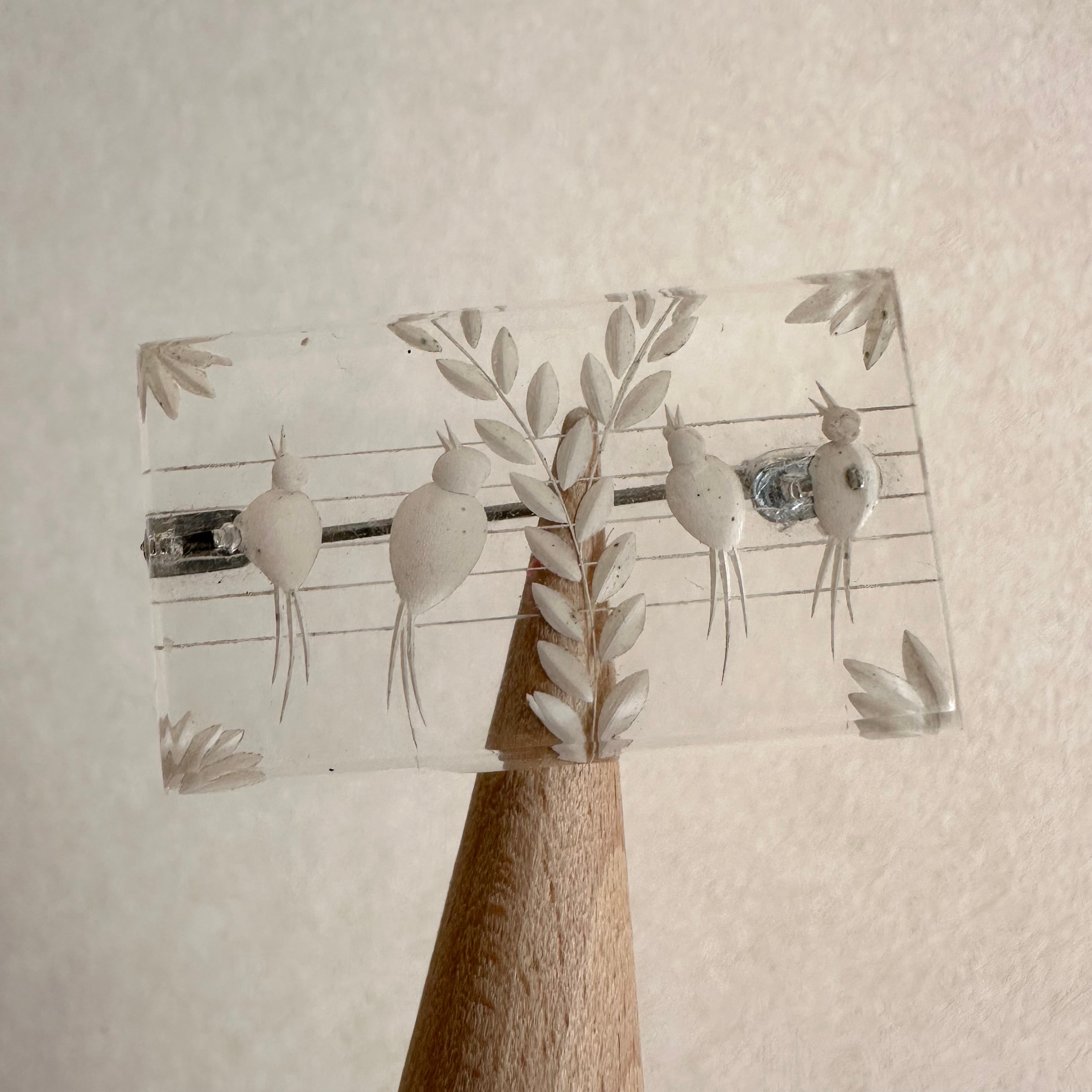 インタリオと呼ばれるルーサイトの裏側を彫ってモチーフを浮かび上がらせる技法を使っています。白い一色でペイントされているので、ダークカラーのアイテムと合わせるとよりデザインがはっきりとわかります。