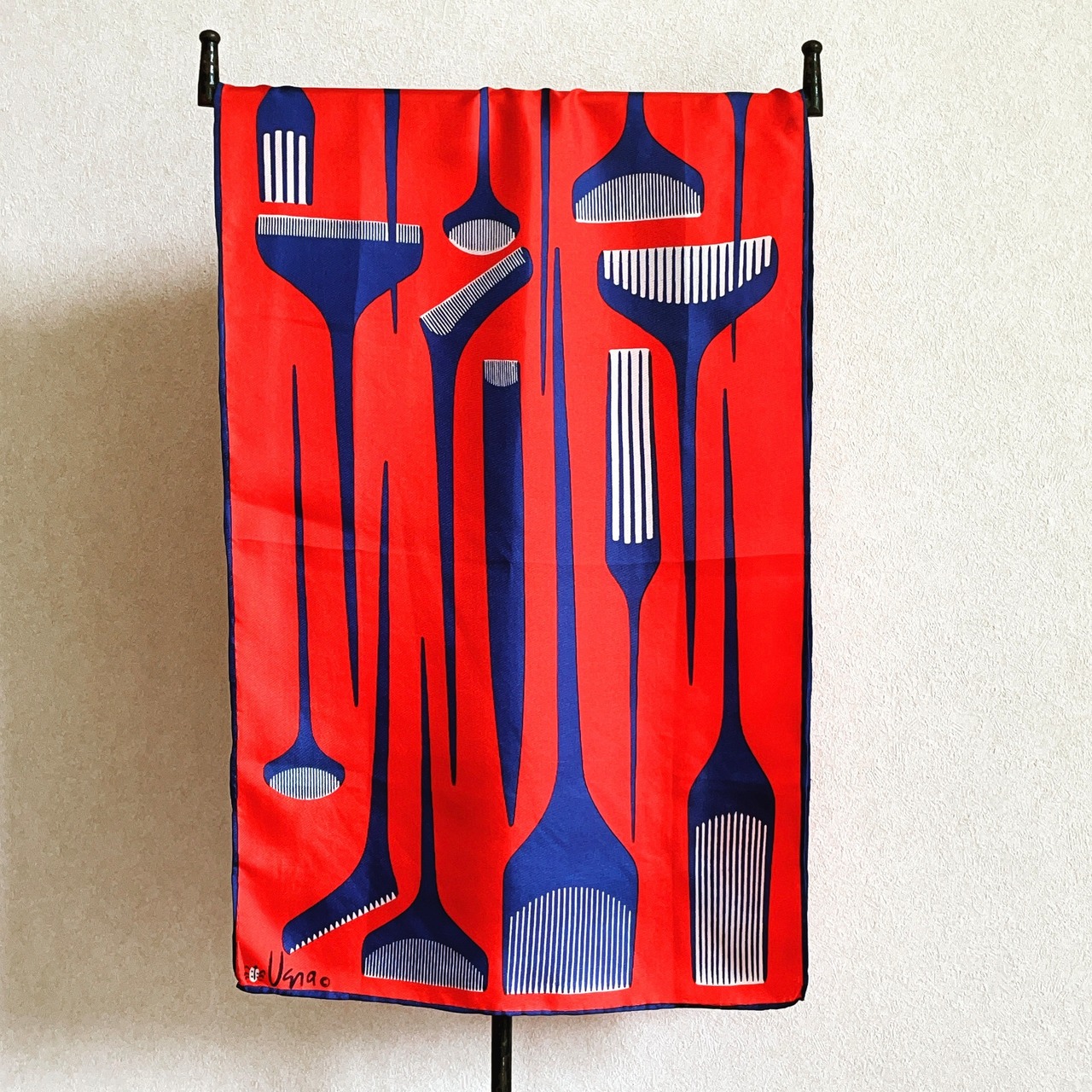 大小いろいろなデザインのクシがポップに描かれたシルクスカーフ。