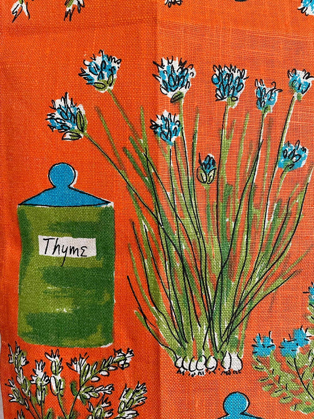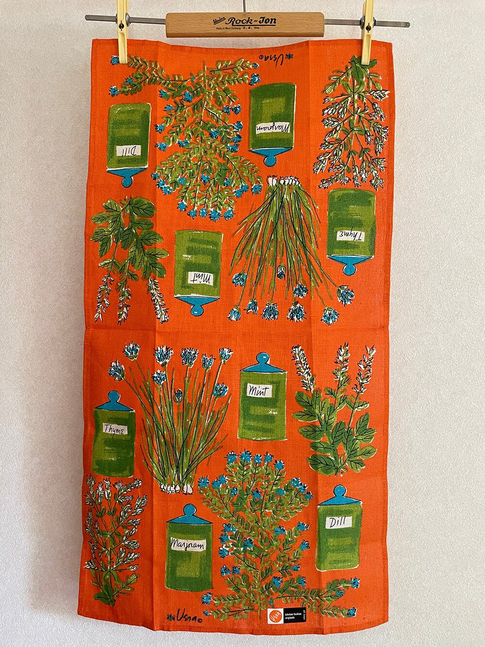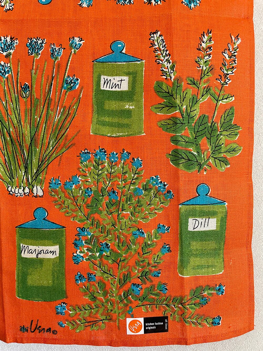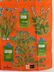 ミント、タイム、ディルなどのハーブとポットが描かれたVeraのリネン。