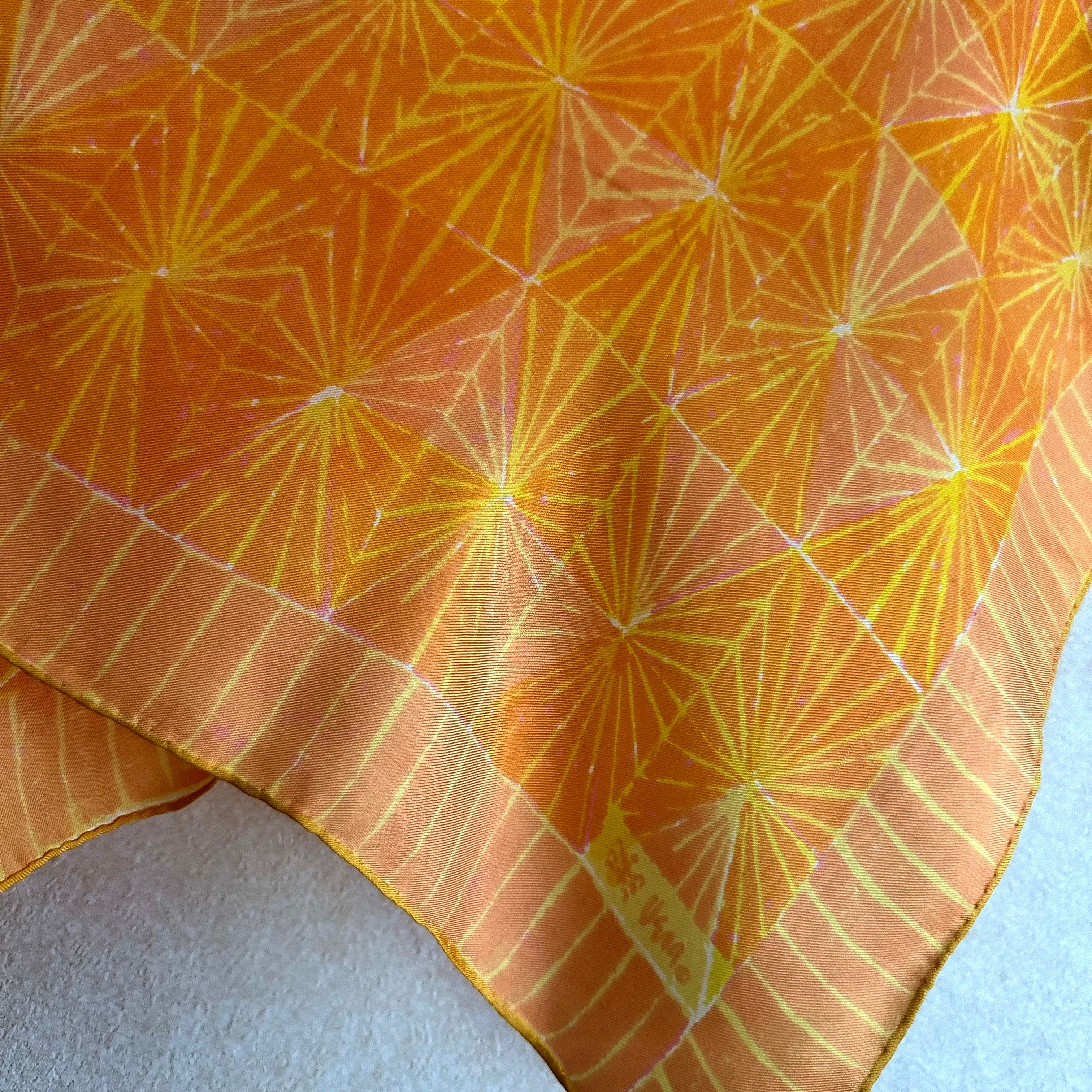 大判のシルクスカーフ、淡いオレンジに放射線状に描かれたイエローのラインがアクセント。